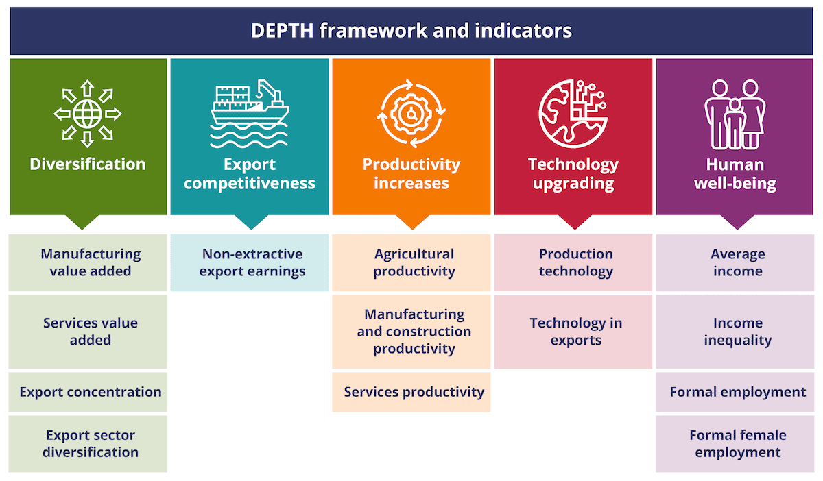 While economic growth is important, it is insufficient to drive Africa’s economic transformation. African economies must tackle the five dimensions of DEPTH: Diversification, Export competitiveness, Productivity increases, Technological upgrading, and Human well-being. Growth with DEPTH is an analytical framework that provides pathways for economic transformation in Africa. In the ATI, DEPTH scores are calculated using 14 indicators.