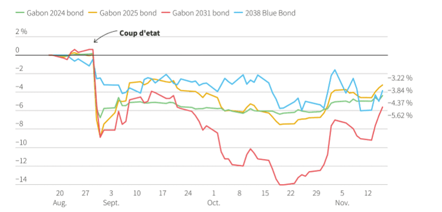 Figure 2 below represents the outperformance of Gabon’s blue bond following the August 2023 coup, thanks to DFC political risk insurance: